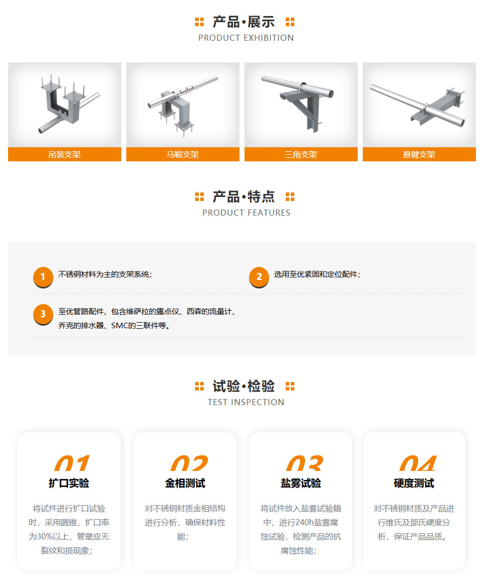 支架和辅材加工预制不锈钢材料时,应避免将碳钢材料存放在周围工作区的工作区。可以用橡胶包裹碳钢部件,防止铁污染不锈钢。如果使用碳钢通道,必须在通道上放置模板并放置在附件中。区应在模板表面加橡胶垫。 专业的不锈钢加工不能用手或脏手套随意接触不锈钢工件,加工时应佩戴清洁的劳保用品。 支架和辅材用于不锈钢加工的工具应符合要求,并应标有易于识别的标志,表明仅用于不锈钢加工。专业的不锈钢加工在工艺上往往存在