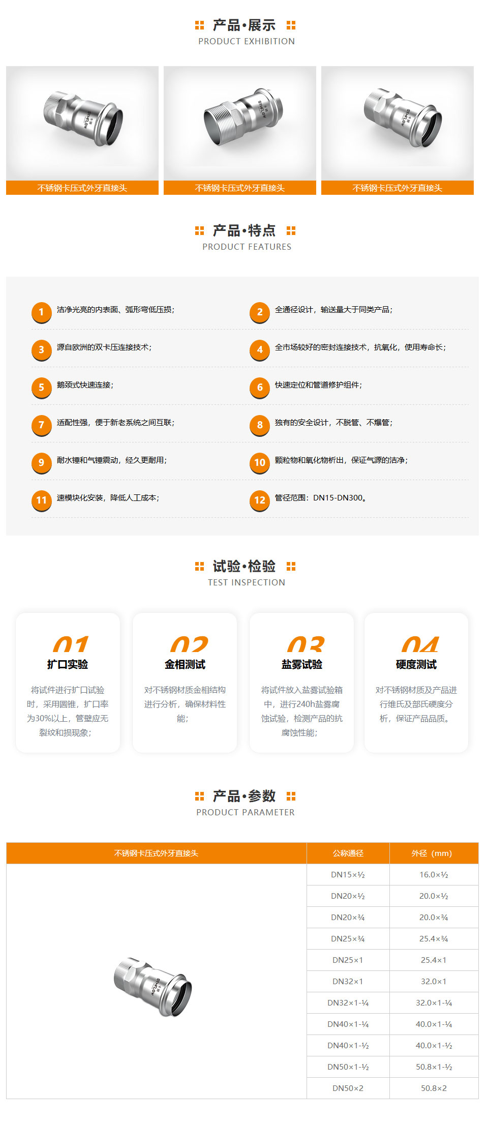 不锈钢卡压式外牙直接头的优点 用于不锈钢管道系统,提高卡压管件的尺寸精度,增加管道误差,适应性更强。 将压缩管插入管内时,橡胶圈不会被切断。 双挤压式胶圈采用不锈钢密封,胶圈的耐用性明显提高。双挤压式密封圈左右两侧均匀挤压。密封圈不会从双水压侧挤出。不足。 不锈钢卡压式外牙直接头在双卡箍接头处,当管道受外力弯曲变形时,密封圈不会受到影响。是技术性能、技术指标和技术水平的双卡压接升级产品。压