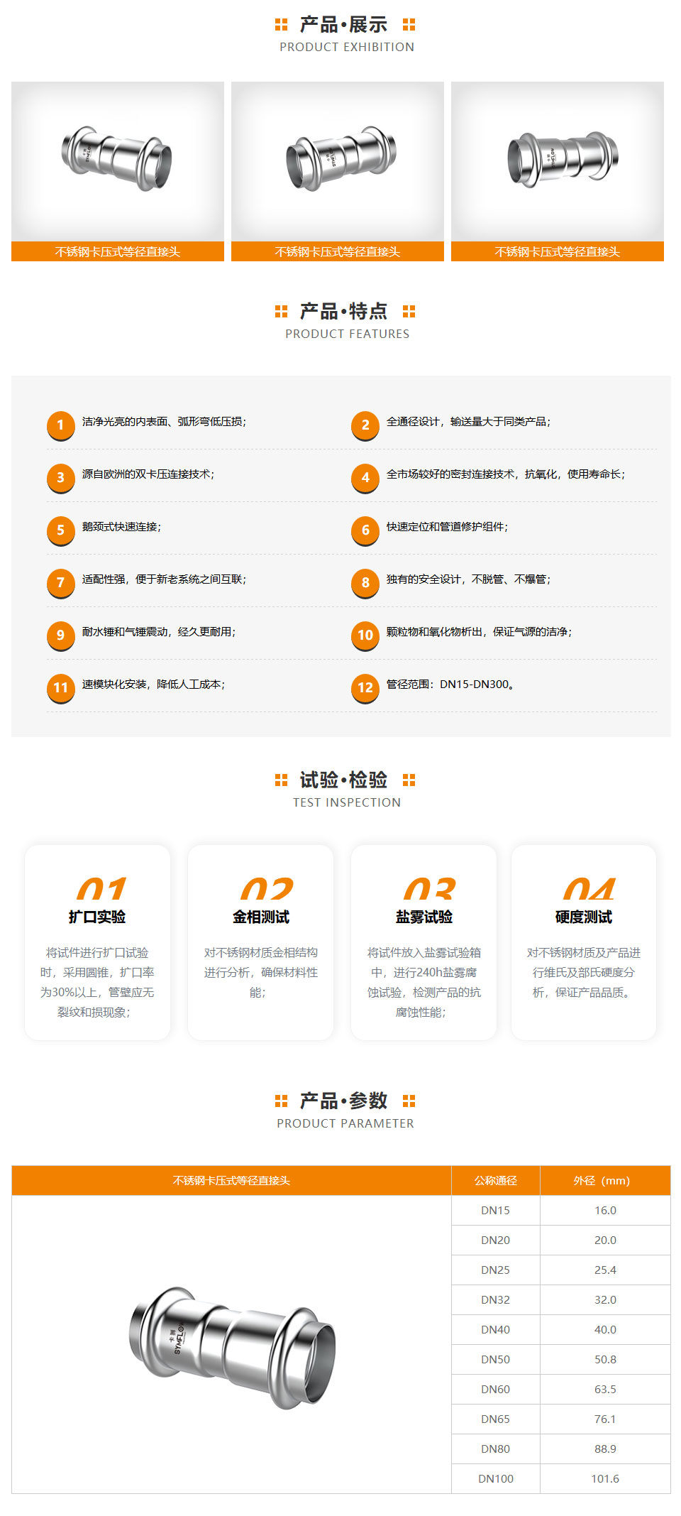 不锈钢卡压式等径直接头广泛应用于建筑给排水、城乡给排水、城市燃气、电力及光缆护套、工业流体输送、农业灌溉等建筑、市政、工农业领域。